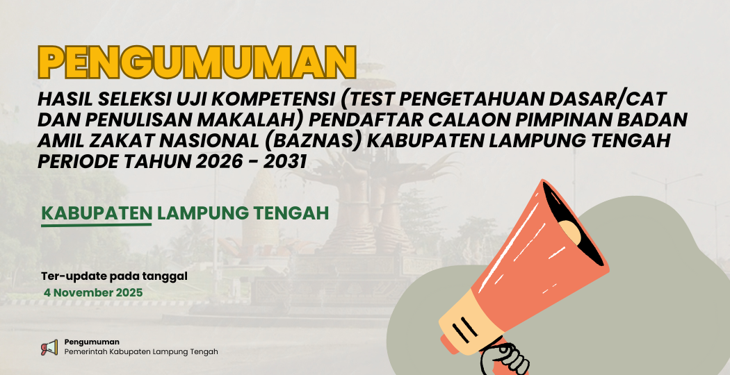 HASIL SELEKSI UJI KOMPETENSI (TEST PENGETAHUAN DASAR/CAT DAN PENULISAN MAKALAH) PENDAFTAR CALAON PIMPINAN BADAN AMIL ZAKAT NASIONAL (BAZNAS) KABUPATEN LAMPUNG TENGAH PERIODE TAHUN 2026 - 2031