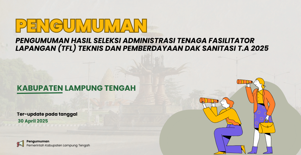 Unduh Pengumuman Selengkapnya melalui tautan di bawah ini: Hasil Seleksi Administrasi Tenaga Fasilitator Lapangan (TFL) Teknis dan Pemberdayaan DAK Sanitasi Tahun Anggaran 2025