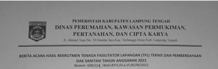 BERITA ACARA HASIL REKRUTMEN TENAGA FASILITATOR LAPANGAN (TFL) TEKNIS DAN PEMBERDAYAAN DAK SANITASI TAHUN ANGGARAN 2012