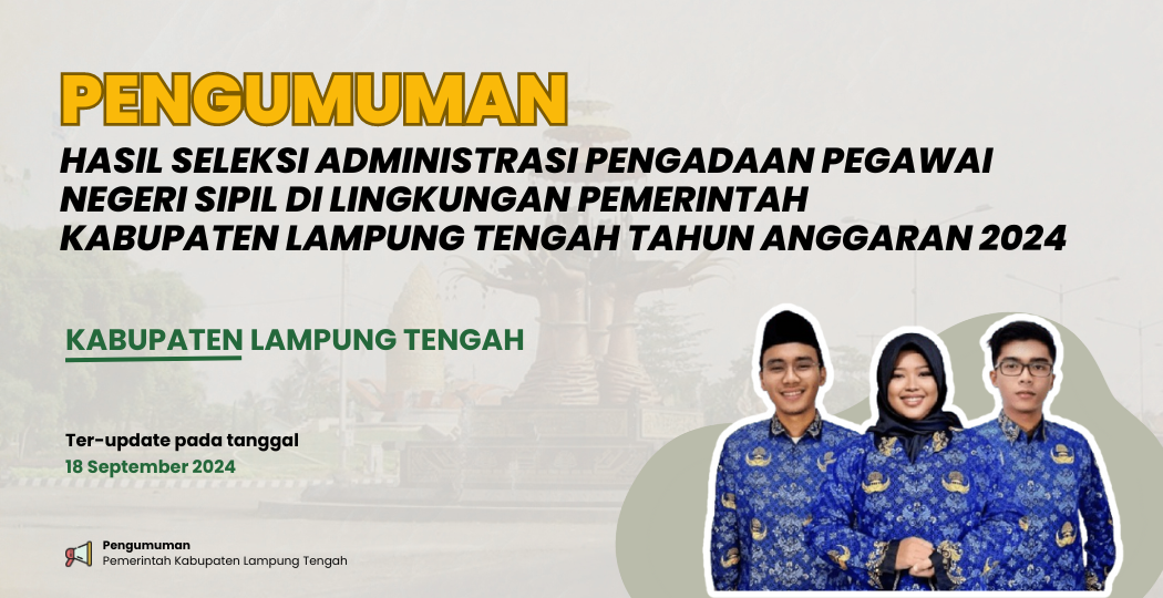 Unduh Pengumuman Selengkapnya pada tautan di bawah ini: Hasil Seleksi Administrasi Pengadaan Pegawai Negeri Sipil di Lingkungan Pemerintah Kabupaten Lampung Tengah Tahun Anggaran 2024