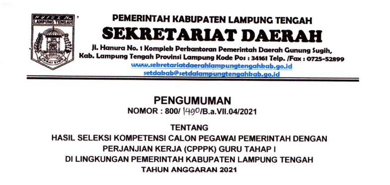 Download dokumen : HASIL KOMPETENSI CPPPK GURU TAHAP I DI LINGKUNGAN PEMERINTAH KABUPATEN LAMPUNG TENGAH JADWAL PELAKSANAAN SELEKSI KOMPETENSI II GURU ASN-PPPK TA 2021 HASIL I HASIL II
