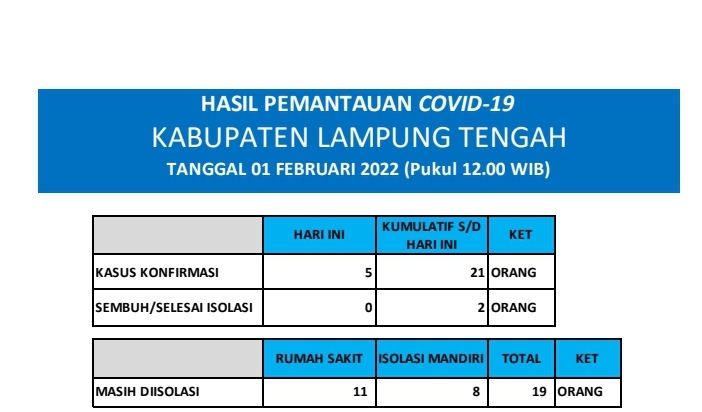 HASIL PEMANTAUAN COVID-19 KABUPATEN LAMPUNG TENGAH : Tanggal 01 Februari 2022