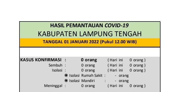 HASIL PEMANTAUAN COVID-19 KABUPATEN LAMPUNG TENGAH : Tanggal 01 Januari 2022