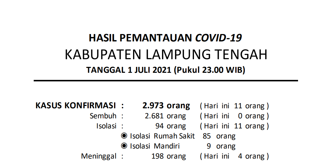 Download dokumen : HASIL PEMANTAUAN COVID-19 KABUPATEN LAMPUNG TENGAH : Tanggal 01 Juli 2021 Pukul 23.00 WIB