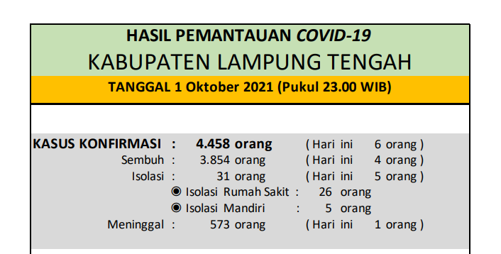 Download dokumen : HASIL PEMANTAUAN COVID-19 KABUPATEN LAMPUNG TENGAH : Tanggal 01 Oktober 2021 Pukul 23.00 WIB