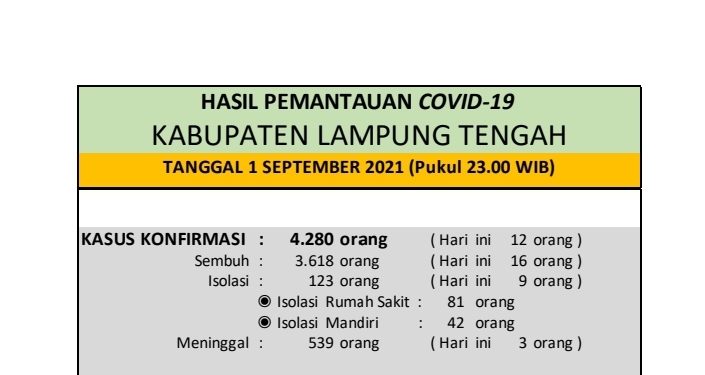 Download dokumen : HASIL PEMANTAUAN COVID-19 KABUPATEN LAMPUNG TENGAH : Tanggal 01 September 2021 Pukul 23.00 WIB