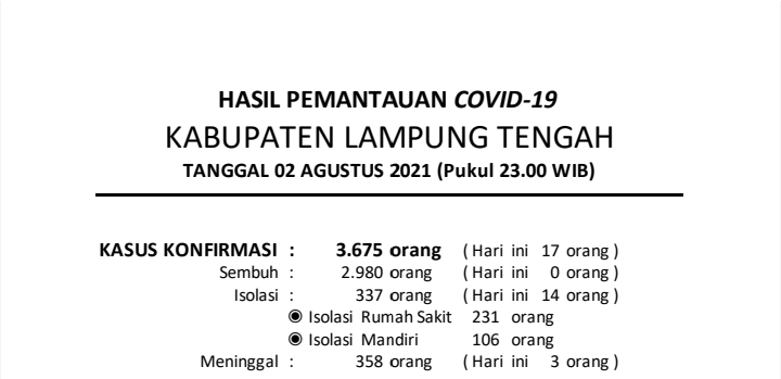 Download dokumen : HASIL PEMANTAUAN COVID-19 KABUPATEN LAMPUNG TENGAH : Tanggal 02 Agustus 2021 Pukul 23.00 WIB