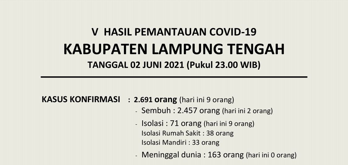 Download dokumen : HASIL PEMANTAUAN COVID-19 KABUPATEN LAMPUNG TENGAH : Tanggal 02 Juni 2021 Pukul 23.00 WIB