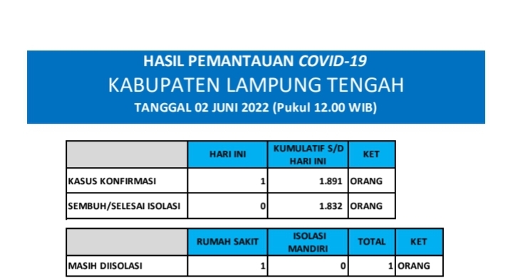 HASIL PEMANTAUAN COVID-19 KABUPATEN LAMPUNG TENGAH : Tanggal 02 Juni 2022