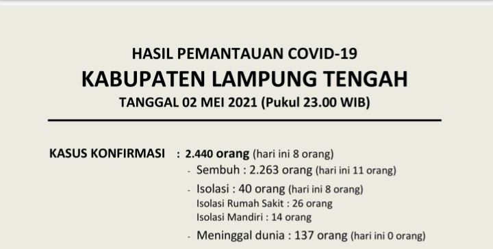 Download dokumen : HASIL PEMANTAUAN COVID-19 KABUPATEN LAMPUNG TENGAH : Tanggal 02 Mei 2021 Pukul 23.00 WIB