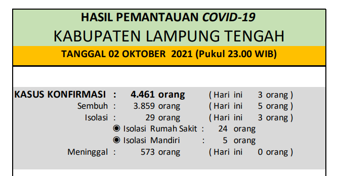 Download dokumen : HASIL PEMANTAUAN COVID-19 KABUPATEN LAMPUNG TENGAH : Tanggal 02 Oktober 2021 Pukul 23.00 WIB