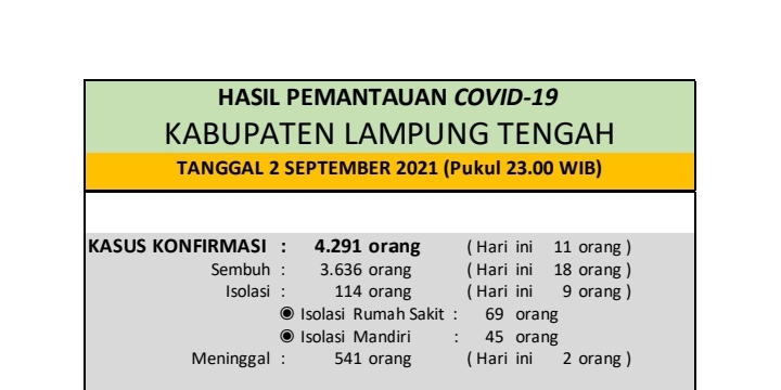 Download dokumen : HASIL PEMANTAUAN COVID-19 KABUPATEN LAMPUNG TENGAH : Tanggal 02 September 2021 Pukul 23.00 WIB