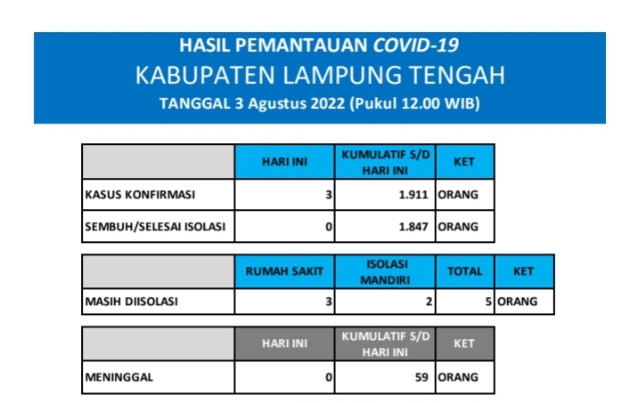 HASIL PEMANTAUAN COVID-19 KABUPATEN LAMPUNG TENGAH : Tanggal 03 Agustus 2022