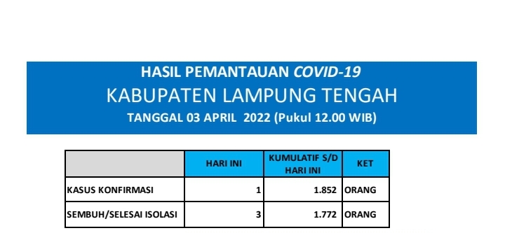HASIL PEMANTAUAN COVID-19 KABUPATEN LAMPUNG TENGAH : Tanggal 03 April 2022