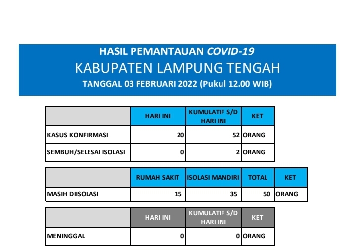 HASIL PEMANTAUAN COVID-19 KABUPATEN LAMPUNG TENGAH : Tanggal 03 Februari 2022
