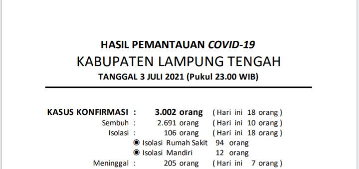 Download dokumen : HASIL PEMANTAUAN COVID-19 KABUPATEN LAMPUNG TENGAH : Tanggal 03 Juli 2021 Pukul 23.00 WIB