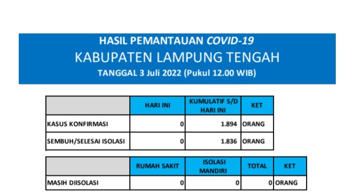 HASIL PEMANTAUAN COVID-19 KABUPATEN LAMPUNG TENGAH : Tanggal 03 Juli 2022