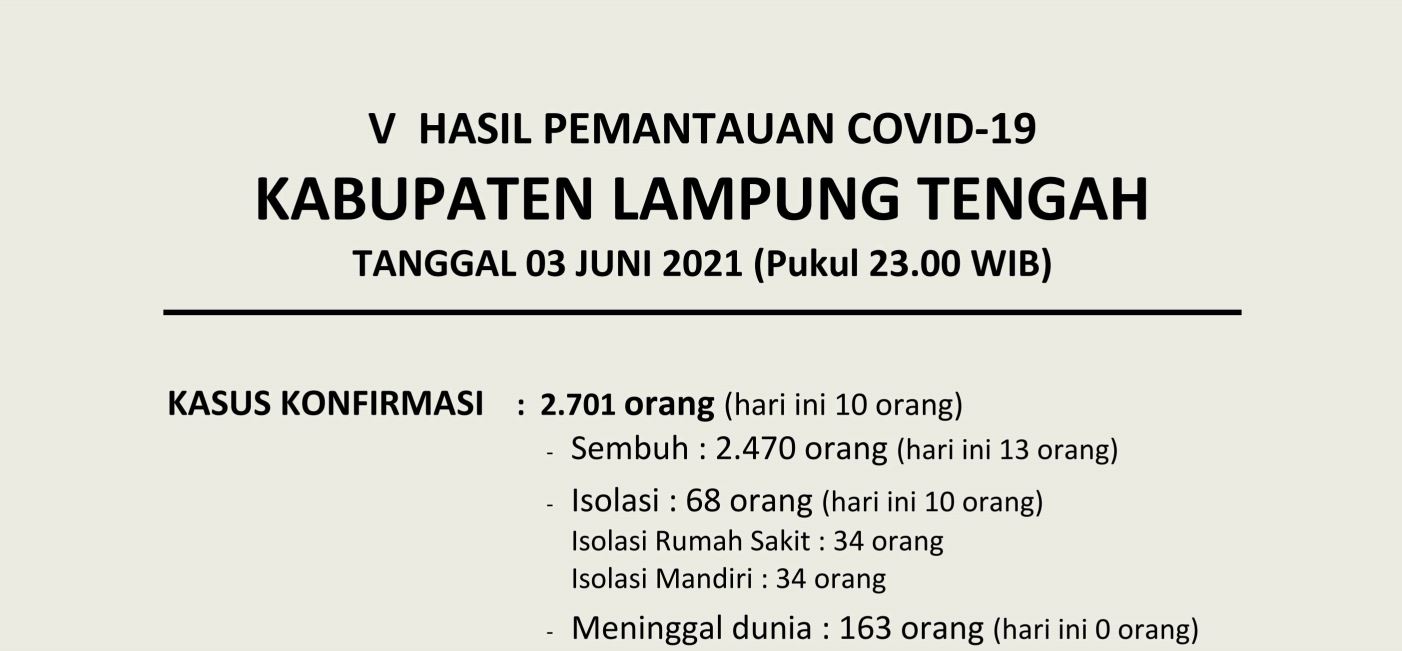 Download dokumen : HASIL PEMANTAUAN COVID-19 KABUPATEN LAMPUNG TENGAH : Tanggal 03 Juni 2021 Pukul 23.00 WIB