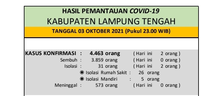 Download dokumen : HASIL PEMANTAUAN COVID-19 KABUPATEN LAMPUNG TENGAH : Tanggal 03 Oktober 2021 Pukul 23.00 WIB