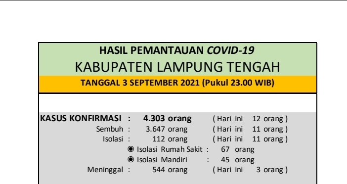 Download dokumen : HASIL PEMANTAUAN COVID-19 KABUPATEN LAMPUNG TENGAH : Tanggal 03 September 2021 Pukul 23.00 WIB