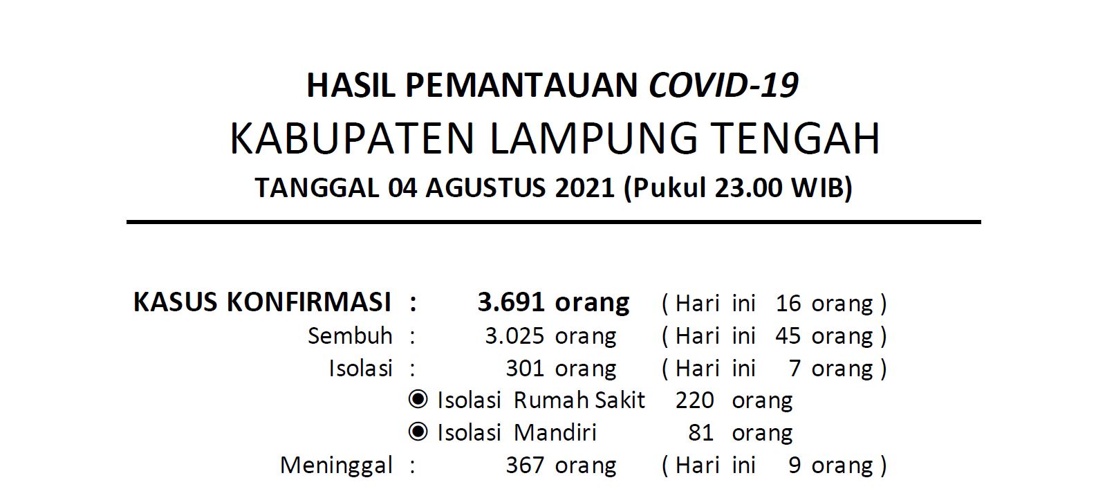 Download dokumen : HASIL PEMANTAUAN COVID-19 KABUPATEN LAMPUNG TENGAH : Tanggal 04 Agustus 2021 Pukul 23.00 WIB