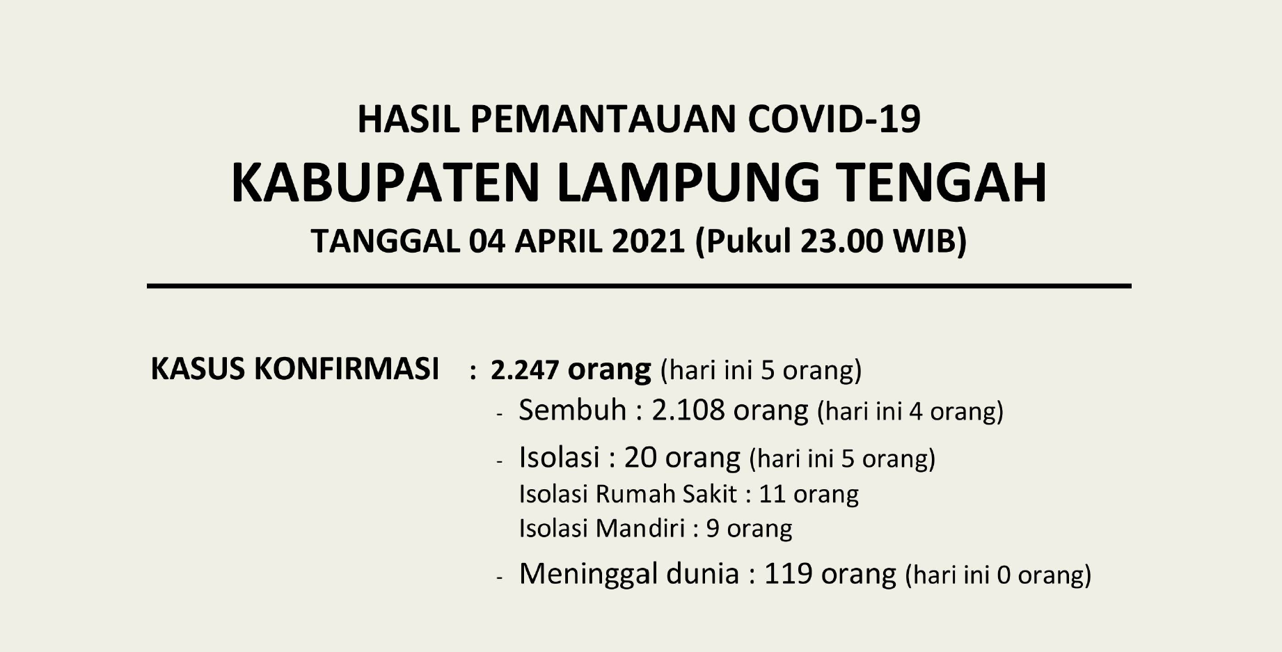 HASIL PEMANTAUAN COVID-19 KABUPATEN LAMPUNG TENGAH : Tanggal 04 April 2021 Pukul 23.00 WIB