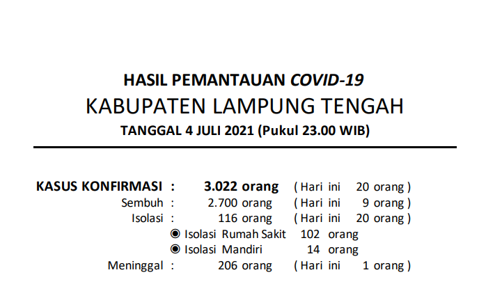 download dokumen : HASIL PEMANTAUAN COVID-19 KABUPATEN LAMPUNG TENGAH : Tanggal 04 Juli 2021 Pukul 23.00 WIB