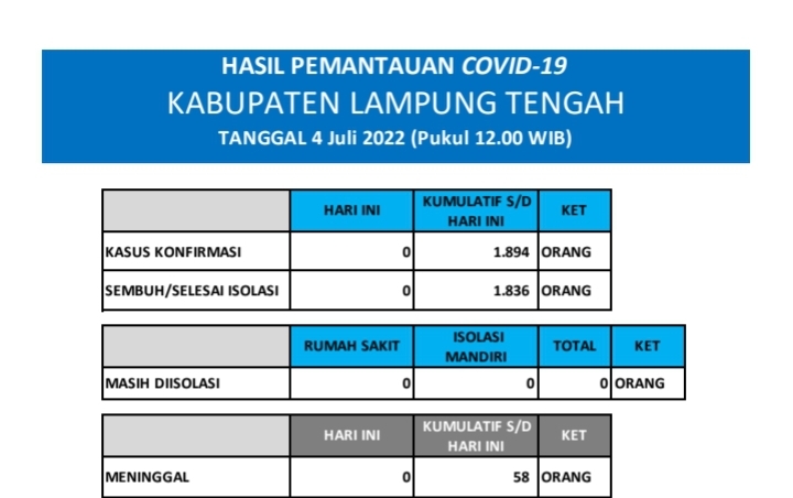HASIL PEMANTAUAN COVID-19 KABUPATEN LAMPUNG TENGAH : Tanggal 04 Juli 2022