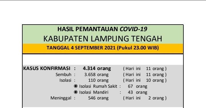 Download dokumen : HASIL PEMANTAUAN COVID-19 KABUPATEN LAMPUNG TENGAH : Tanggal 04 September 2021 Pukul 23.00 WIB