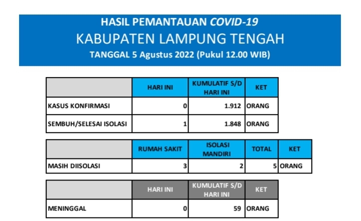 HASIL PEMANTAUAN COVID-19 KABUPATEN LAMPUNG TENGAH : Tanggal 05 Agustus 2022