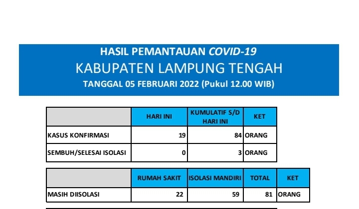 HASIL PEMANTAUAN COVID-19 KABUPATEN LAMPUNG TENGAH : Tanggal 05 Februari 2022