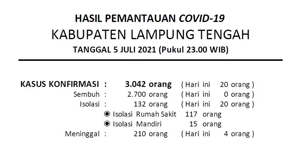 Download dokumen : HASIL PEMANTAUAN COVID-19 KABUPATEN LAMPUNG TENGAH : Tanggal 05 Juli 2021 Pukul 23.00 WIB