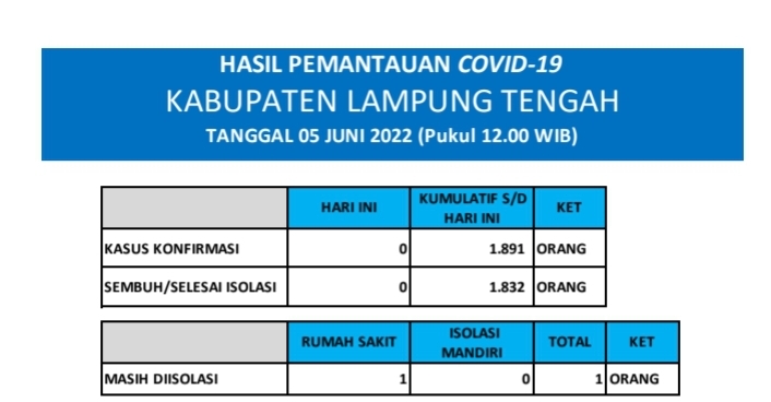 HASIL PEMANTAUAN COVID-19 KABUPATEN LAMPUNG TENGAH : Tanggal 05 Juni 2022