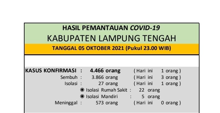 Download dokumen : HASIL PEMANTAUAN COVID-19 KABUPATEN LAMPUNG TENGAH : Tanggal 05 Oktober 2021 Pukul 23.00 WIB