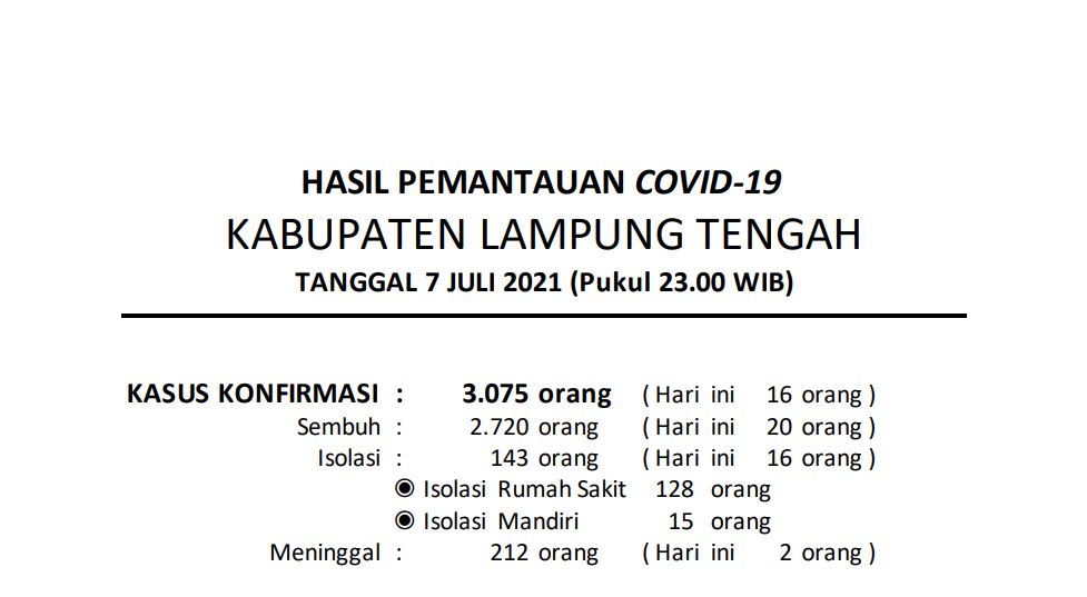 Download dokumen : HASIL PEMANTAUAN COVID-19 KABUPATEN LAMPUNG TENGAH : Tanggal 07 Juli 2021 Pukul 23.00 WIB
