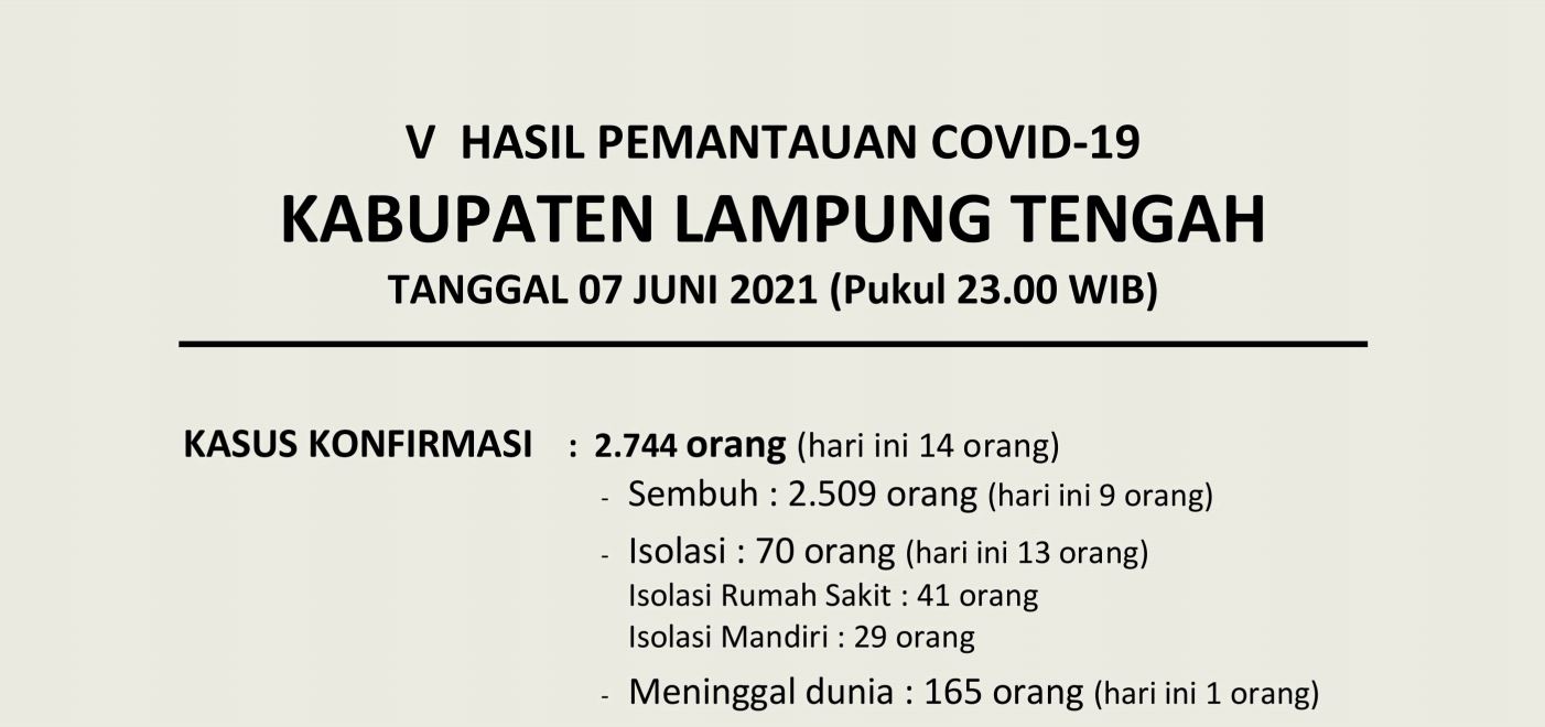 Download dokumen : HASIL PEMANTAUAN COVID-19 KABUPATEN LAMPUNG TENGAH : Tanggal 07 Juni 2021 Pukul 23.00 WIB