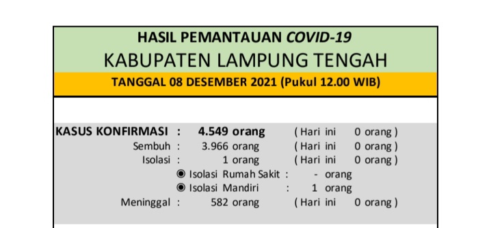 HASIL PEMANTAUAN COVID-19 KABUPATEN LAMPUNG TENGAH : Tanggal 08 Desember 2021 (Sampai dengan pukul 12.00 WIB)