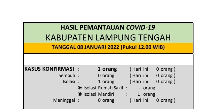 HASIL PEMANTAUAN COVID-19 KABUPATEN LAMPUNG TENGAH : Tanggal 08 Januari 2022