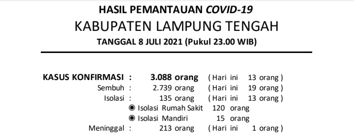Download Dokumen : HASIL PEMANTAUAN COVID-19 KABUPATEN LAMPUNG TENGAH : Tanggal 08 Juli 2021 Pukul 23.00 WIB