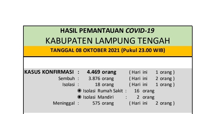 Download dokumen : HASIL PEMANTAUAN COVID-19 KABUPATEN LAMPUNG TENGAH : Tanggal 08 Oktober 2021 Pukul 23.00 WIB