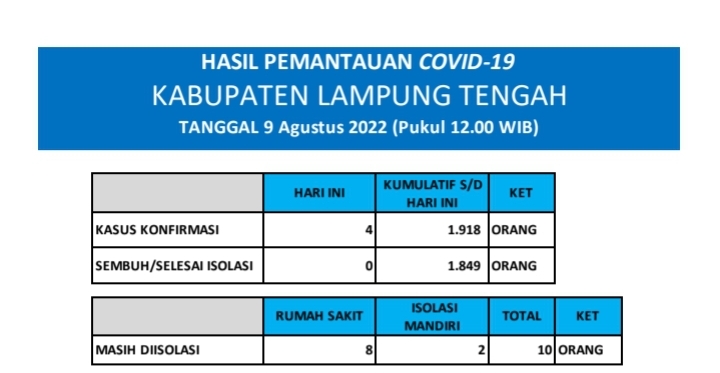 HASIL PEMANTAUAN COVID-19 KABUPATEN LAMPUNG TENGAH : Tanggal 09 Agustus 2022