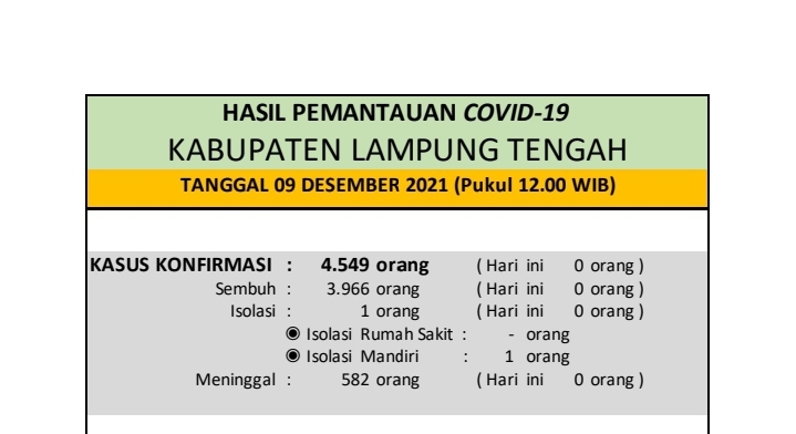 HASIL PEMANTAUAN COVID-19 KABUPATEN LAMPUNG TENGAH : Tanggal 09 Desember 2021 (Sampai dengan pukul 12.00 WIB)