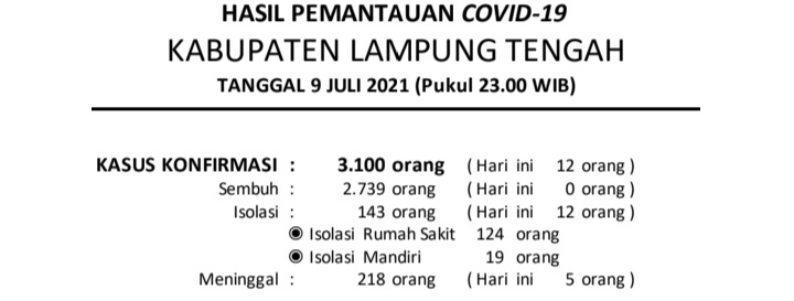 Download dokumen : HASIL PEMANTAUAN COVID-19 KABUPATEN LAMPUNG TENGAH : Tanggal 09 Juli 2021 Pukul 23.00 WIB