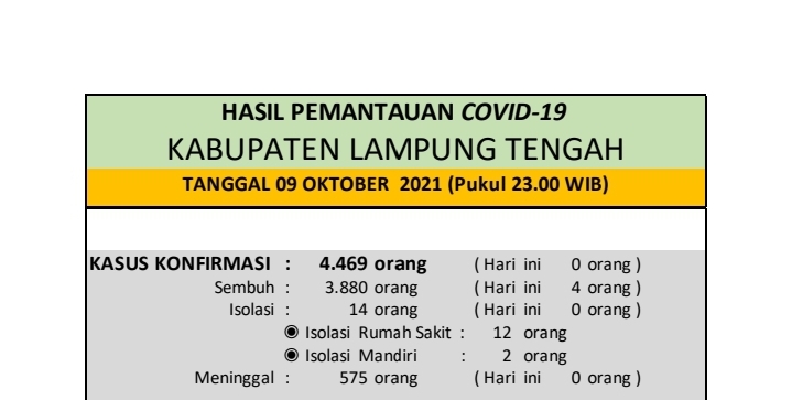 Download dokumen : HASIL PEMANTAUAN COVID-19 KABUPATEN LAMPUNG TENGAH : Tanggal 09 Oktober 2021 Pukul 23.00 WIB