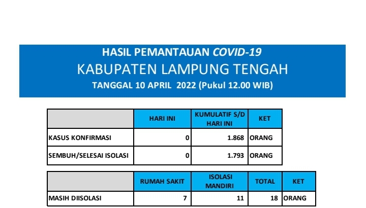 HASIL PEMANTAUAN COVID-19 KABUPATEN LAMPUNG TENGAH : Tanggal 10 April 2022