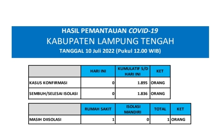 HASIL PEMANTAUAN COVID-19 KABUPATEN LAMPUNG TENGAH : Tanggal 10 Juli 2022
