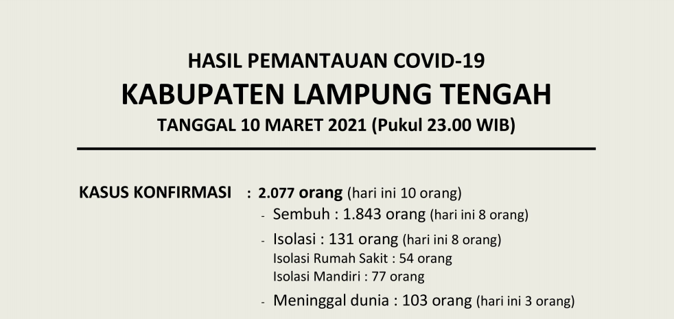 HASIL PEMANTAUAN COVID-19 KABUPATEN LAMPUNG TENGAH TANGGAL 10 MARET 2021 PUKUL 23.00 WIB