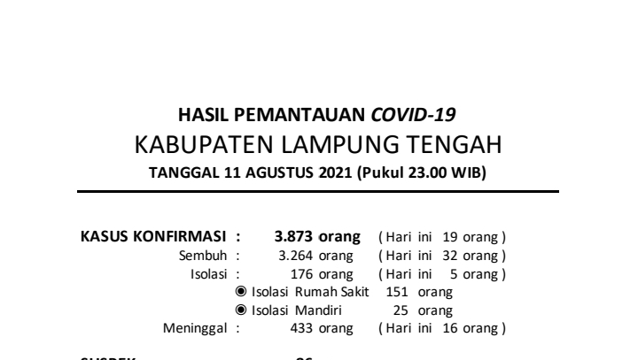 Download dokumen : HASIL PEMANTAUAN COVID-19 KABUPATEN LAMPUNG TENGAH : Tanggal 11 Agustus 2021 Pukul 23.00 WIB