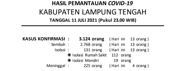 Download dokumen : HASIL PEMANTAUAN COVID-19 KABUPATEN LAMPUNG TENGAH : Tanggal 11 Juli 2021 Pukul 23.00 WIB