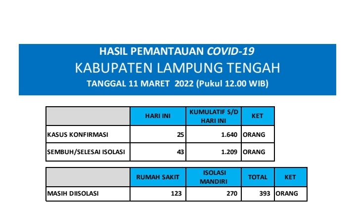 HASIL PEMANTAUAN COVID-19 KABUPATEN LAMPUNG TENGAH : Tanggal 11 Maret 2022